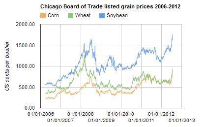 미국뿐 만아니라 최대 밀 생산지인 우크라이나와 주요 콩 생산지인 브라질 등에서도 가뭄은 계속되고 있다. 때문에 밀과 콩 가격도 두달 만에 각각 32%, 22% 씩 크게 올랐다.